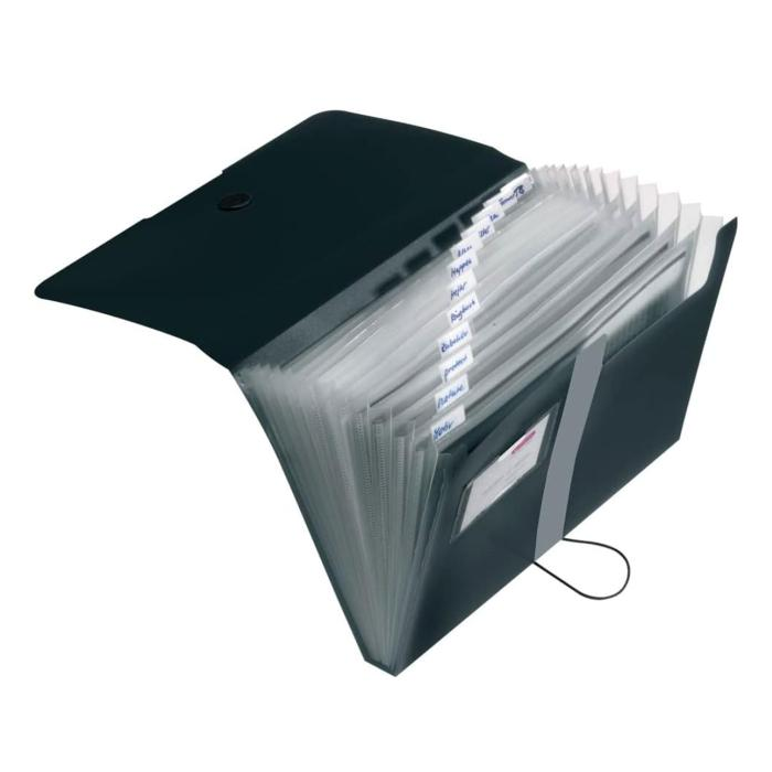 Plastová aktovka produktového radu Easy Orga s 12 plastovými priehradkami s indexami a malou priehradkou vizitkového formátu. Kapacita 300 listov. Uzatváranie gumičkou o plastový krúžok. Väčšie balenie 10 ks. Farba čierna.