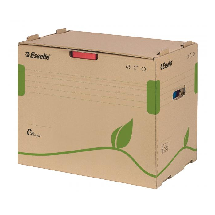 Krabica z archivačného systému Esselte ECO navrhnutá so zeleným prístupom. 100% recyklovateľná s 85% podielom spotrebiteľského odpadu, certifikovaná FSC. Veľkosť optimalizovaná iba na papiere A4 s cieľom minimalizovať odpad pri výrobe.