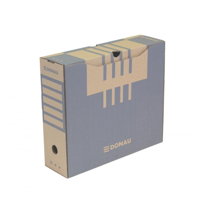 Archívny box z trojvrstvovej lepenky s certifikátom FSC® (drevo na jej výrobu pochádza z lesov, obhospodarovaných udržateľným spôsobom), bez obsahu kyseliny (pH 7,5). Vhodný na archiváciu dokumentov do formátu A4 s otvorom na ľahkú manipuláciu. Možnosť archivovať aj zakladač Donau. Predtlače na popis na dlhšej i kratšej strane umožňuje skladovanie vo vodorovnej aj zvislej polohe. Box je využiteľný samostatne alebo v kombinácii s archivačnými krabicami. Gramáž 390 g. Rozmery 297x100x339 mm. Väčšie balenie 20 ks.
