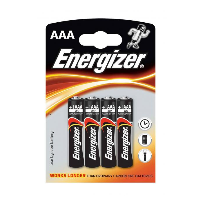 Alkalické mikrotužkové batérie pre každodenné použitie vhodné do prístrojov s vyššími nárokmi na odber energie (napr. hračky, diaľkové ovládače, lampy). Vydržia až 7 x dlhšie ako obyčajné zinko-chloridové batérie. Odolávajú teplotám od 20 °C po +60 °C. Bal. 4 ks.