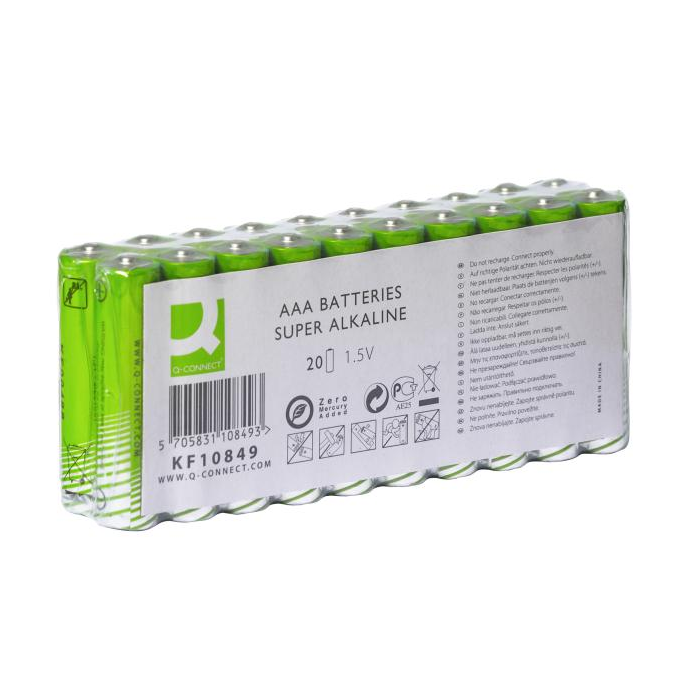 Univerzálna vysokovýkonná alkalická 1,5 V batéria Q-Connect. Neobsahujú žiadnu pridanú ortuť. Typ AAA. Balenie obsahuje 20 ks batérií.