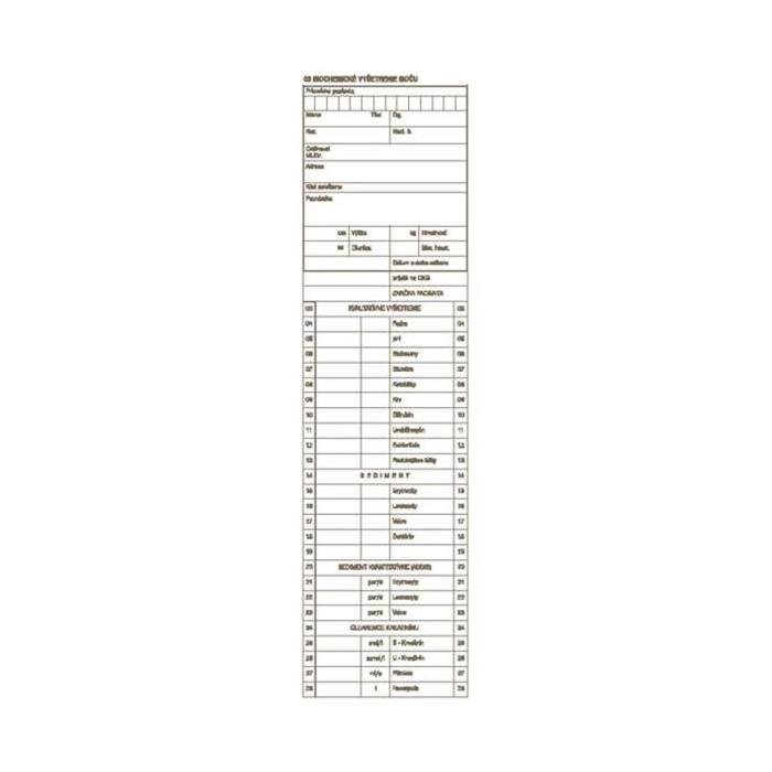 Tlačivo na odber moču, ktoré sa používa na biochemické vyšetrenie. Samoprepisovacie tlačivo obsahuje viaceré kópie, ktoré sa automaticky prepisujú na jednotlivé listy, čo je praktické pre lekárov a laboratóriá.