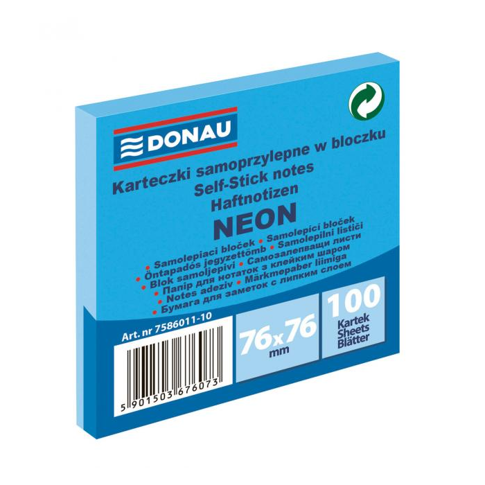 Bloček Donau neónový, 76 x 76 mm, modrý, 100 lístkov