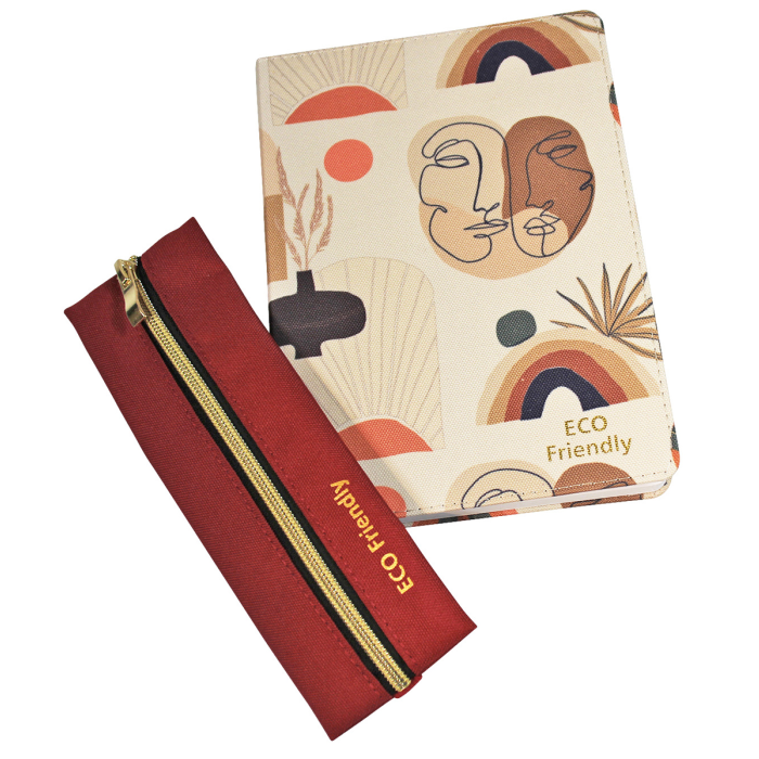 Blok má približne formát A5 so samostatným puzdrom na perá, obal a peračník z recyklovaného PET, 96 listov, papier 70 g/m², bodkovaná mriežka.