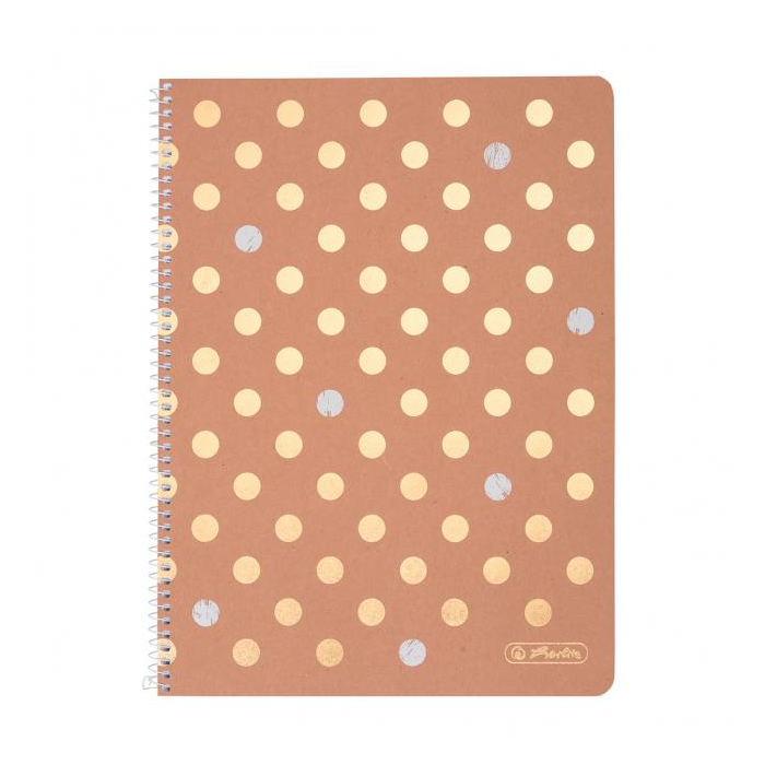 Poznámkový blok Pure Glam formátu A4 má zaoblené rohy, zaoblenú špirálu, eurodierovanie a mikroperforáciu. Papier 70 g / m2, dosky so vzhľadom hrubého papiera s reliéfom zlatých a bielych bodiek, jednoduchá biela špirála.