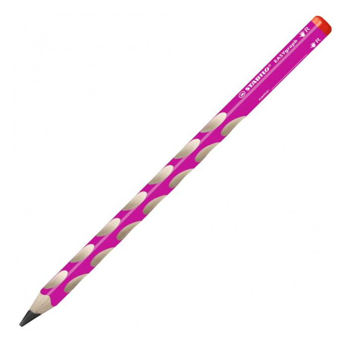 Prvá ergonomicky tvarovaná grafitová ceruzka vyrobená osobitne pre pravákov. Trojhranný dizajn, protišmykové plochy pre uvolnené držanie. Priemer tuhy 3,15 mm, tvrdosť HB vhodná pre písanie i skicovanie. Balenie 12 ks. Farba ružová.