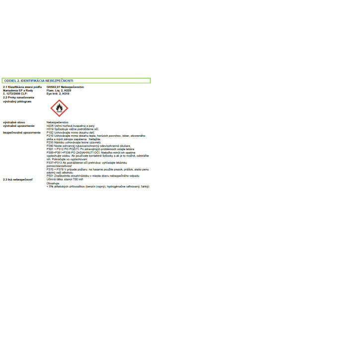 etanol 700 ml/l, < 5% alifatických uhľovodíkov, parfum