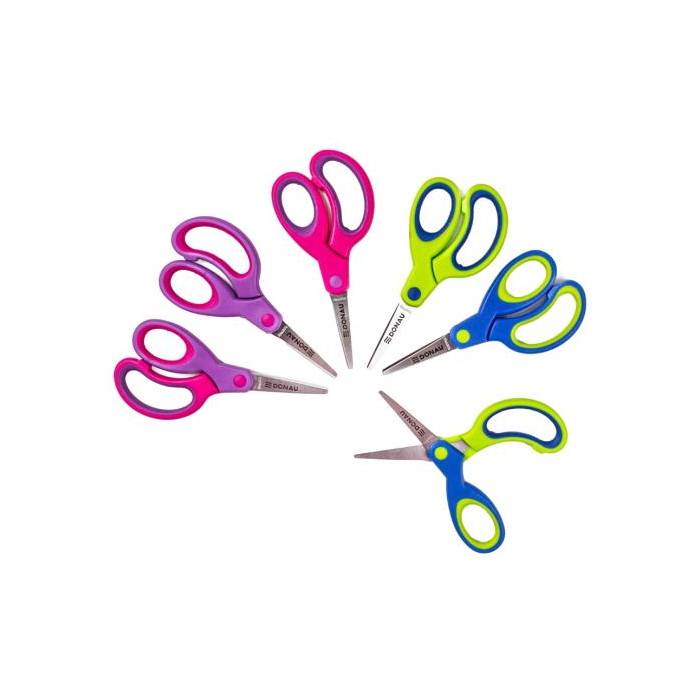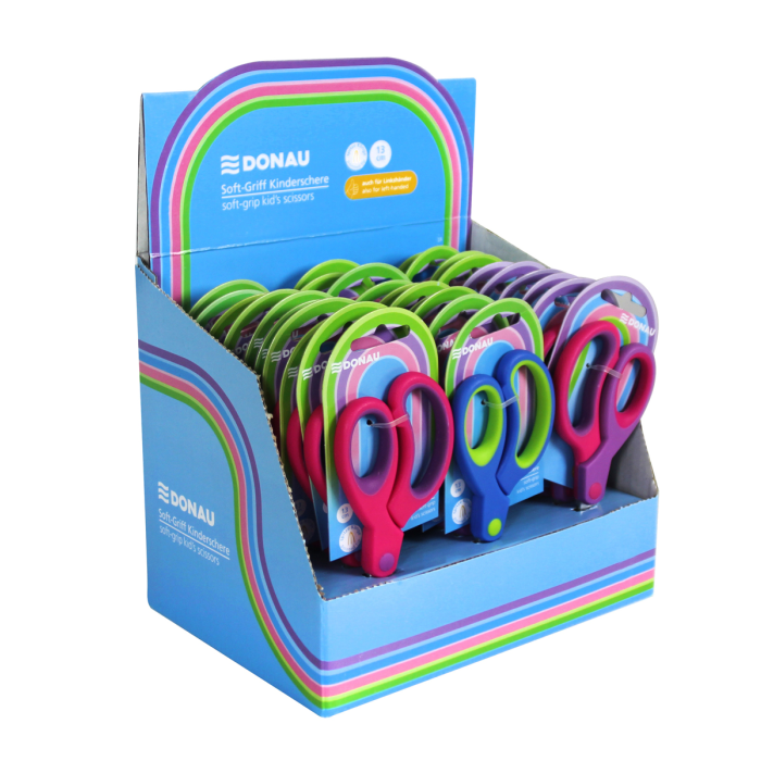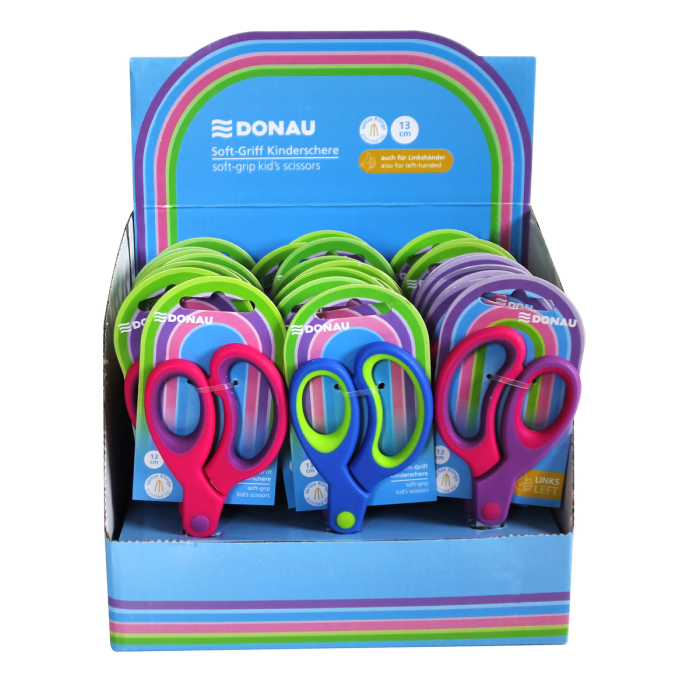Detské nožnice DONAU Soft Grip ostrá čepeľ, 13 cm, mix farieb, displej 30 ks