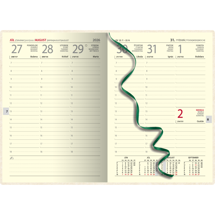 Certifikovaný týždenný diár s prehľadným slovenským kalendáriom na každý týždeň. Na obal je použitý vysokokvalitný papier NAPURA s prírodným dizajnom, 100 % recyklovateľný, s lacetkou. Vďaka vysokej kvalite vlákien je možná: termorazba, razba fóliou alebo ÚV tlač.