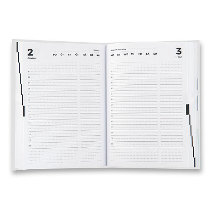 Denný záznam, každý deň je na jednej strane s časovým rozvrhom 7:00 - 21:00. 192 listov.