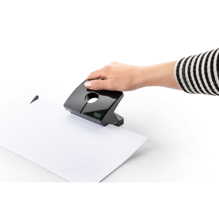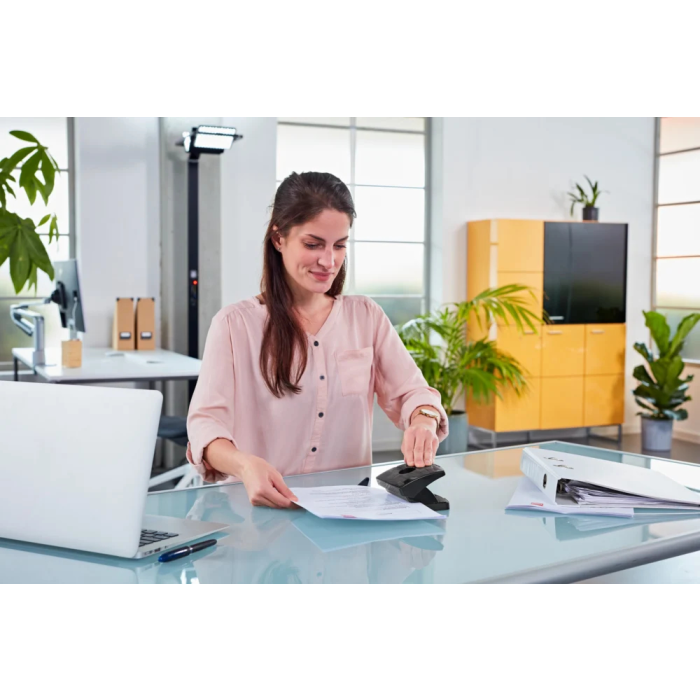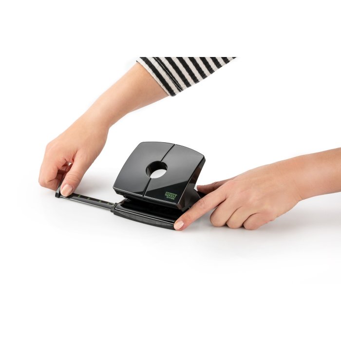 Dierovačka s kovovou základňou pre profesionálne použitie z kolekcie šetrnej k životnému prostrediu re+new, s vrchnou časťou zo 64% recyklovaného plastu a posuvným pravítkom vo farbách a dizajne zhodnom so zošívačkou B 2 re+new. Rozpätie dier 8 cm, priemer dier 5,5 mm. Hmotnosť 350 g. Záruka 10 rokov. Kapacita dierovania 20 listov. Farba čierna.
