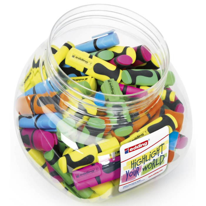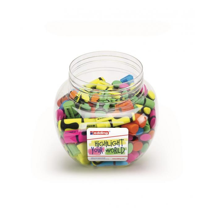 Displej 100 kusov mini zvýrazňovačov edding so zrezaným hrotom so šírkou stopy 1 - 3 mm. Neónový pigment s maximálnym jasom, protišmyková ergonomická rukoväť. Uzáver s klipom.