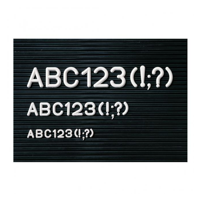 Biele plastové písmená, číslice a znaky k informačným tabuliam. Krabica so samostatnými priehradkami pre každé písmeno. Výška písmen 20 mm. Spolu obsahuje 280 znakov.