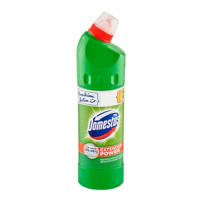 Riedený - dezinfekcia: Podlahy a pracovné plochy: prilejte 180 ml prípravku Domestos do 5 litrov vody. Nemusíte oplachovať. Nepoužívajte neriedený na podlahy. Špongie a handričky na riad: prilejte 90 ml prípravku Domestos do vedra do polovice naplneného vodou a nechajte 60 minút namáčať.