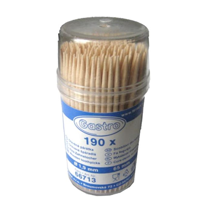 Drevené špáradlá v kelímku s uzáverom 190 ks / priemer 2 x 65 mm. Najvhodnejšie použité na jednohubky a rôzne menšie lahôdky. V kelímku s uzáverom pre praktickejšie a hygienickejšie použitie. Model veľmi vhodný aj pre reštaurácie. Od nepamäti jeden z hlavných pomocných nástrojov pre hodovanie.