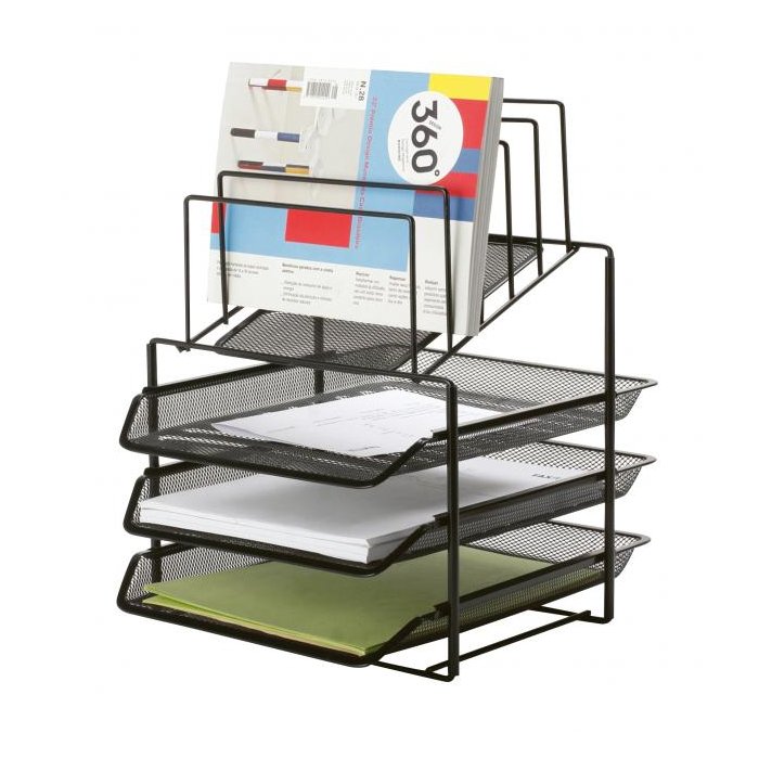 Stojan s tromi zásuvkami, vybavený dodatočným miestom pre katalógy, letáky alebo listy (5 priehradiek). Rozmery (š × v × h) 300 × 350 × 420 mm. Farba čierna.