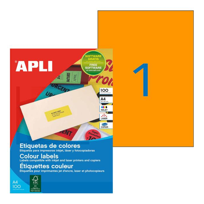 Etikety farebné 210x297mm APLI A4 100 hárkov fluo oranžové