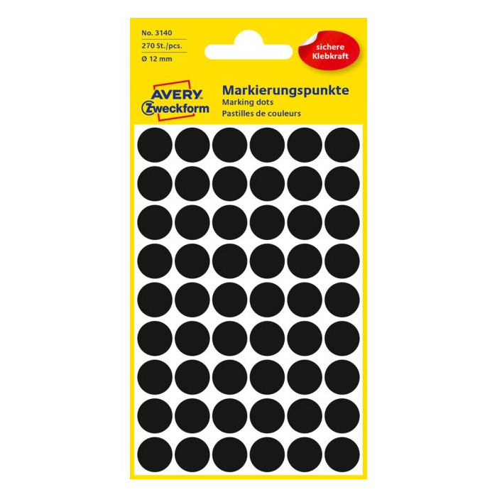 Kruhové etikety na ručný popis. Priemer 12 mm, v balení 270 etikiet. Farba čierna.