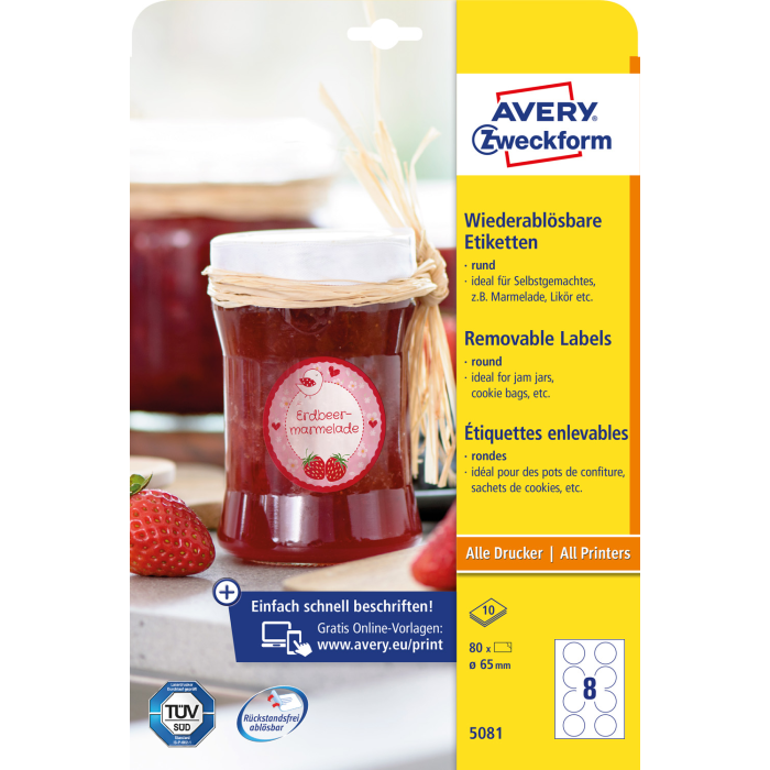 od konkurencie. Spoľahlivá priľnavosť ku sklu, fólii aj papieru. Ľahké odlepenie etikiet bez zanechania stôp po lepidle. Vhodné pre všetky druhy tlačiarní. Šablóny a softvér pre tlač etikiet zadarmo - výber z prázdnych či už navrhnutých, moderných