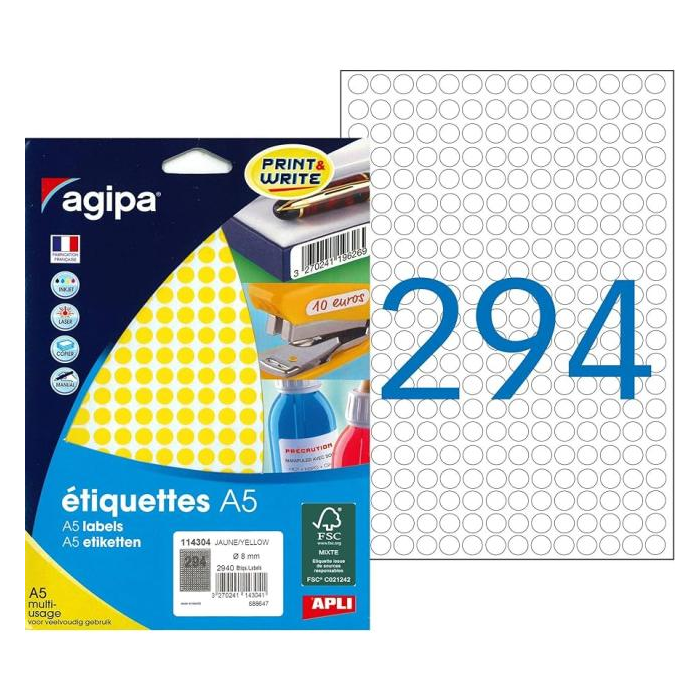 Etikety kruhové 8mm Agipa A5 žlté