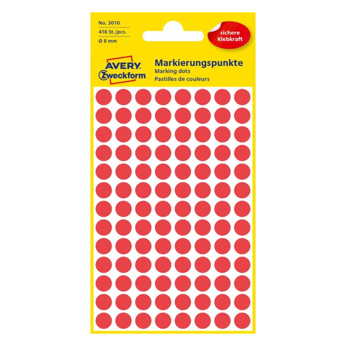 Kruhové etikety na ručný popis. Priemer 8 mm. Farba červená. Etikety v balení : 416 kusov.