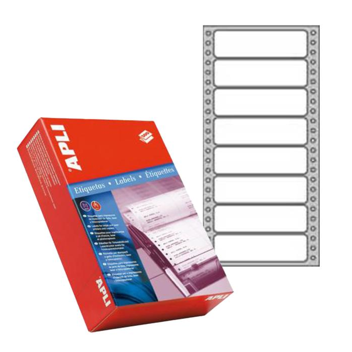 Tabelačné etikety na páse skladaných hárkov s postrannou vodiacou perforáciou, vhodné do ihličkových tlačiarní. Sú rozmiestnené v jednom rade na skladanom hárku. Farba biela. Balenie 500 hárkov.