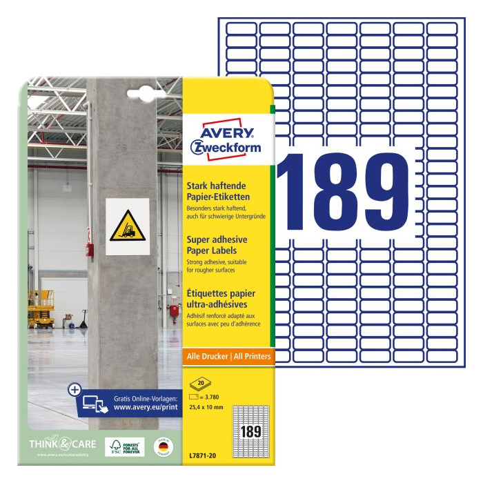 Biele, extrémne priľnavé papierové etikety sú dvakrát pevnejšie ako bežné papierové etikety. Vďaka tomu sú štítky vo formáte 25,4 x 10 mm obzvlášť vhodné na označovanie a označovanie produktov a inventára a na vytváranie varovných a bezpečnostných upozornení v interiéri. Papierové štítky sa lepia aj na ťažké povrchy, ako sú nerovné, drsné, vlhké alebo zaprášené povrchy pri rôznych teplotách. Môžete sa spoľahnúť na zaručený chod tlačiarne bez zaseknutia bez akýchkoľvek usadenín lepidla v tlačiarni. Etikety je možné tlačiť na všetkých bežných laserových a atramentových tlačiarňach.