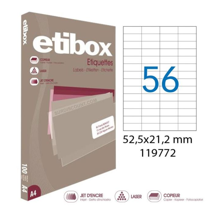 Cenovo výhodné etikety vhodné do laserových a atramentových tlačiarní, ako aj kopírovacích strojov. Rozmery: 52,5x21,2 mm Počet etikiet: 5600 Balenie: 100 hárkov