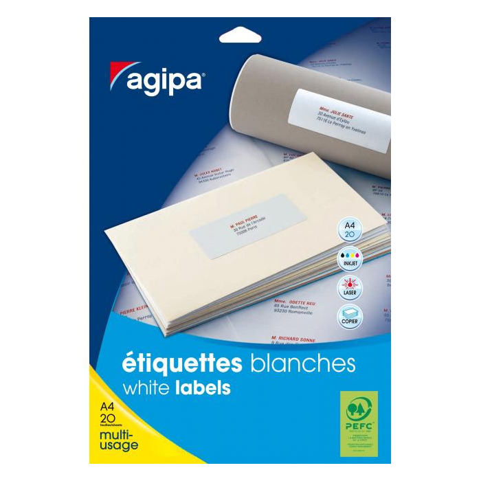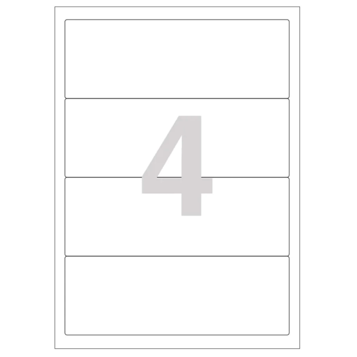 Etikety so zaoblenými rohami na tlač v atramentových a laserových tlačiarňach. Gramáž 158 g/-m2, hrúbka 154 um. Formát A4. Farba biela. Rozmery: 190x60 mm Počet etikiet: 4 x 20 Balenie: 20 hárkov