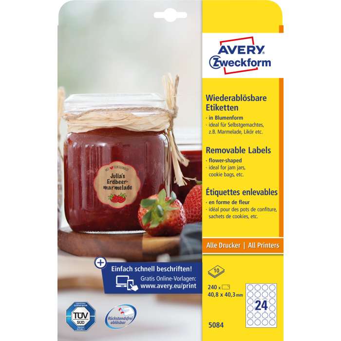 od konkurencie. Spoľahlivá priľnavosť ku sklu, fólii aj papieru. Ľahké odlepenie etikiet bez zanechania stôp po lepidle. Vhodné pre všetky druhy tlačiarní. Šablóny a softvér pre tlač etikiet zadarmo - výber z prázdnych či už navrhnutých, moderných