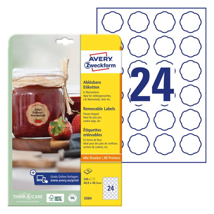 Etikety v tvare kvetu 40,8x40,3mm Avery 10 hárkov biele