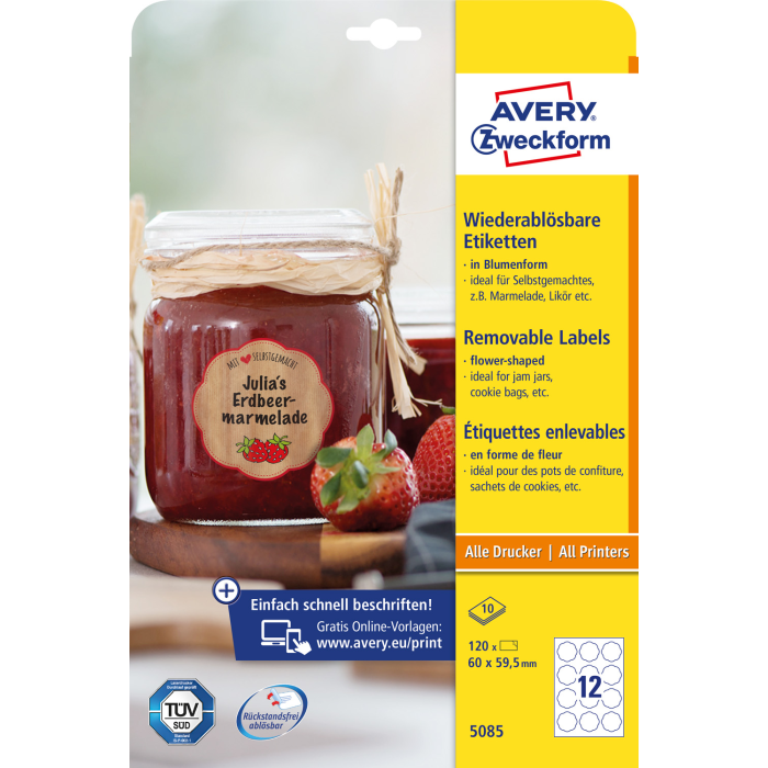 od konkurencie. Spoľahlivá priľnavosť ku sklu, fólii aj papieru. Ľahké odlepenie etikiet bez zanechania stôp po lepidle. Vhodné pre všetky druhy tlačiarní. Šablóny a softvér pre tlač etikiet zadarmo - výber z prázdnych či už navrhnutých, moderných