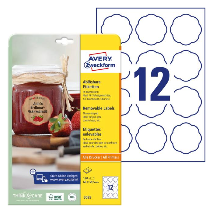 Etikety v tvare kvetu 60x59,5mm Avery 10 hárkov biele