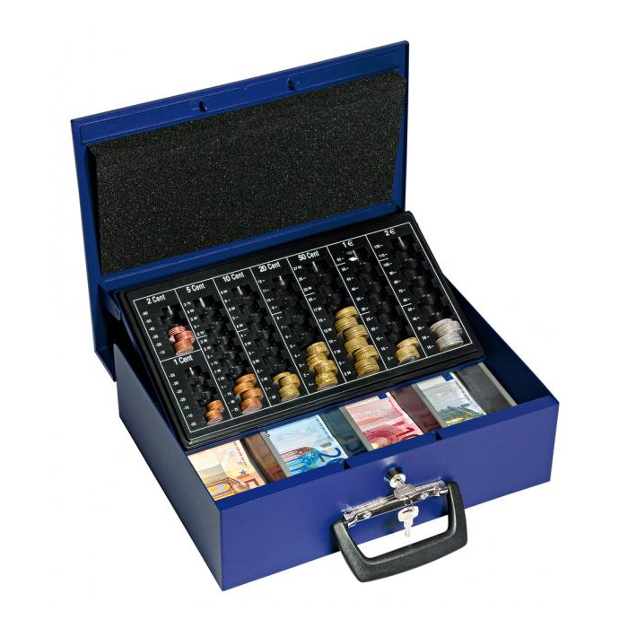 Pokladnička vybavená mincovou priehradkou s ôsmimi oddielmi na eurá a centy a štyrmi prístupnými priehradkami na bankovky. Pena na vnútornej strane veka na zabránenie premiešania mincí pri prenose, dve madlá na prenos pokladničky. K zámku sú dodávané dva kľúče.