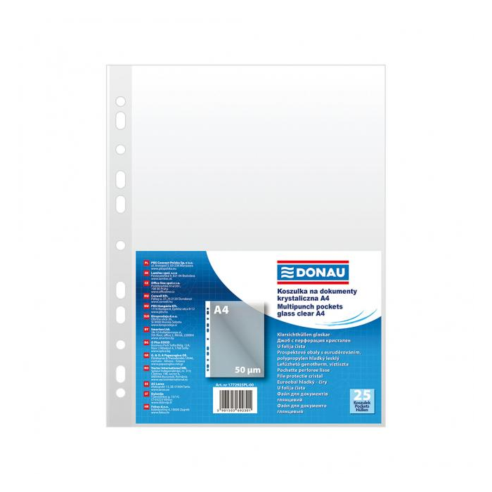 Priehľadné číre euroobaly z polypropylénu. Otvor zhora, eurodierovanie, povrch lesklý a hladký. Formát A4. Hrúbka 50 mic. Balenie 25 ks.