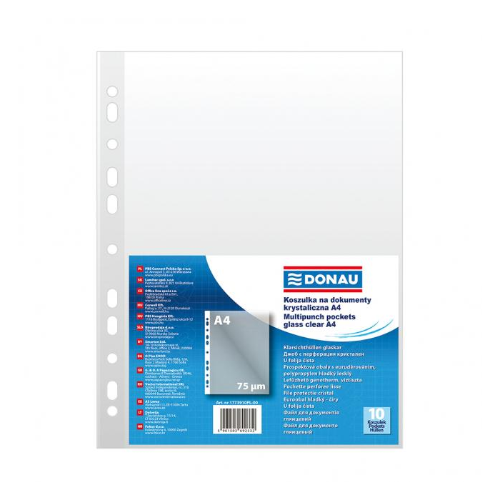 Priehľadné číre euroobaly z polypropylénu balené v sáčku. Otvor zhora, eurodierovanie, povrch lesklý a hladký. Formát A4. Hrúbka 75 mikrónov. Balenie 10 ks.