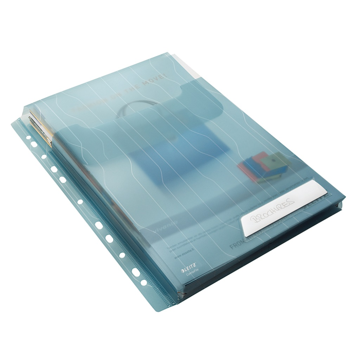 Závesný obal na katalógy a obsiahlejšie dokumenty, ktorý kombinuje vlastnosti euroobalov a obalov vďaka patentovanej skrývateľnej multiperforácii do špeciálneho puzdra. Vyrobený z kvalitného priehľadného PP s embosovaným vzorom. Hrúbka 200 um. Kapacita 150 listov papiera formátu A4. Balenie 3 ks. Farba: modrá
