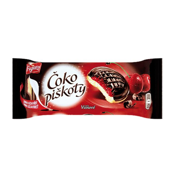 Jemné pečivo so želé (52 %) s višňovou príchuťou polomáčané v horkej čokoláde (15 %).