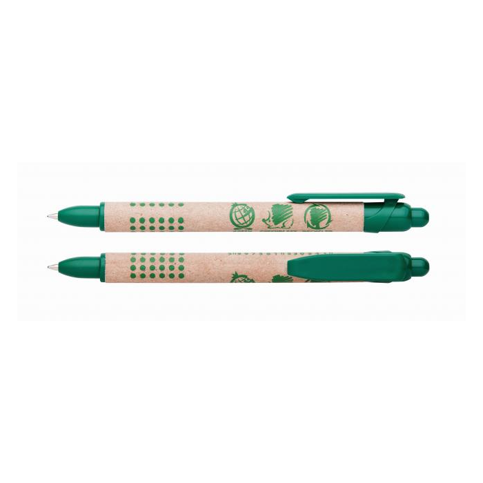 Klikacie guľôčkové pero vyrobené zo 100 % recyklovaného papiera a 30 % recyklovaného plastu. Zostavené s náplňou X-20. Dĺžka písania 2500 m. Papierové časti sú recyklovateľné. Náplň nie je vymeniteľná, ale je odnímateľná pre selektívnu likvidáciu odpadu. Guľôčka 0,8 mm. Farba tuhy: modrá.