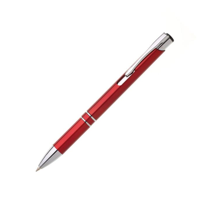 Plastové guľôčkové pero OIRA s kovovými doplnkami. Modrá náplň veľkoobjemová. Farba červená.