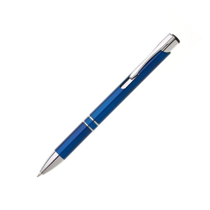 Plastové guľôčkové pero OIRA s kovovými doplnkami. Modrá náplň veľkoobjemová. Farba modrá.