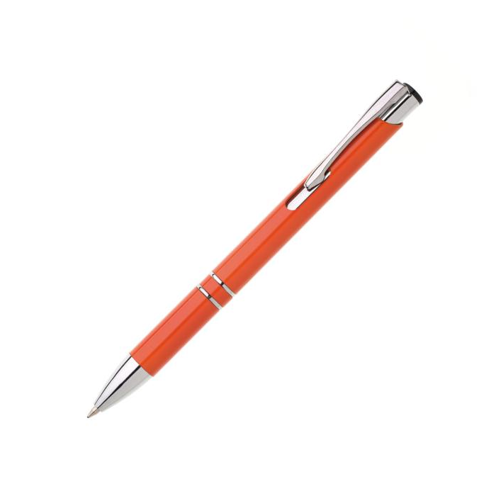 Plastové guľôčkové pero OIRA s kovovými doplnkami. Modrá náplň veľkoobjemová. Farba oranžová.