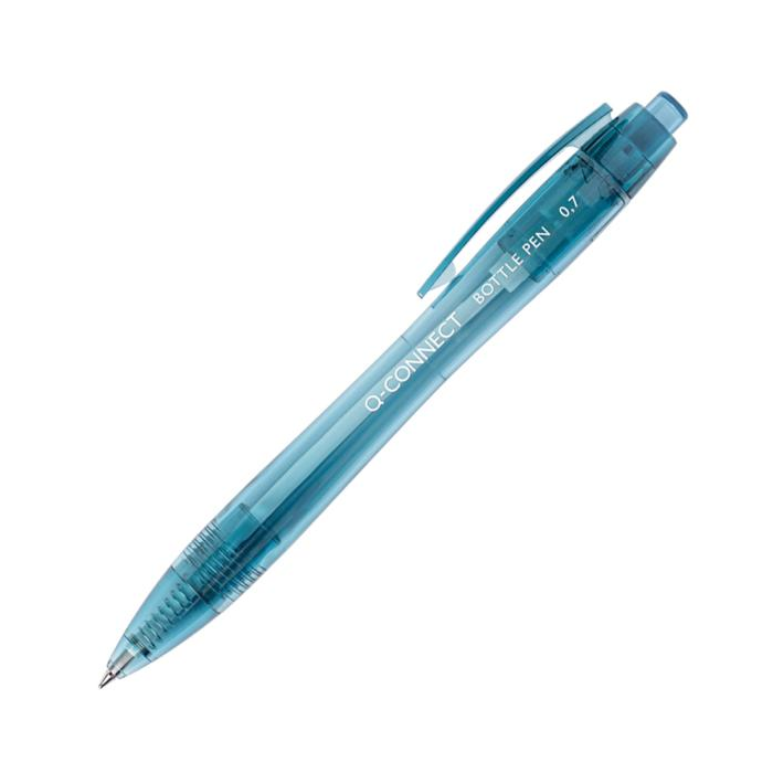 Guľôčkové pero klikacie, plastové telo vyrobené zo 100% recyklovaných PET fliaš, s klipom. Farba atramentu modrá, nedá sa doplniť. Šírka stopy 0,7 mm.