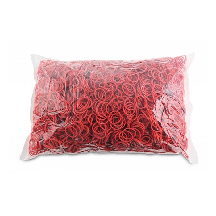 Odolné a pružné gumičky vyrobené z materiálu s prímesou gumy (60 %). Rozmery (hrúbka × šírka) 1,5 × 1,5 mm. Priemer 20 mm. Farba červená.