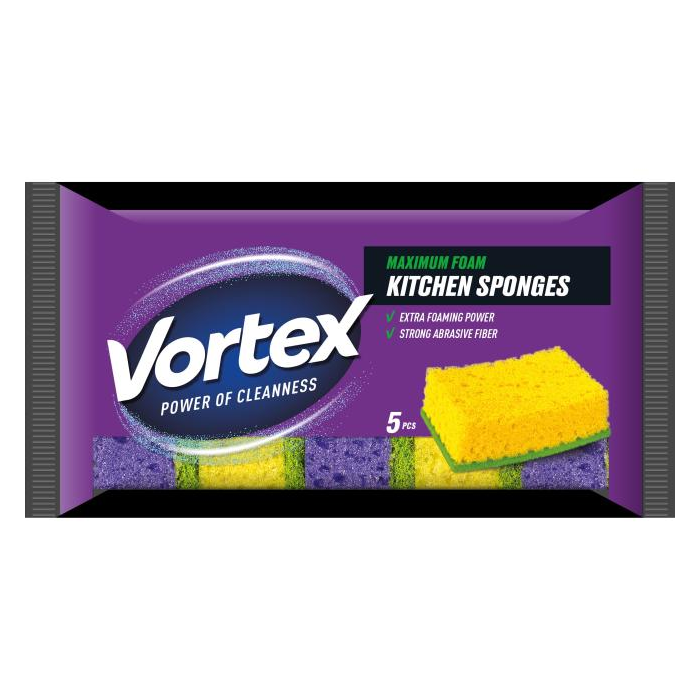 Vortex` MACROPOROUS kuchynské špongie, na jednej strane makropórovitá pena a na druhej silné čistiace abrazívne talianske vlákna, ktoré ľahko odstránia nečistotu z riadov. Vytvárajú veľké množstvo jemnej peny, 5 ks.
