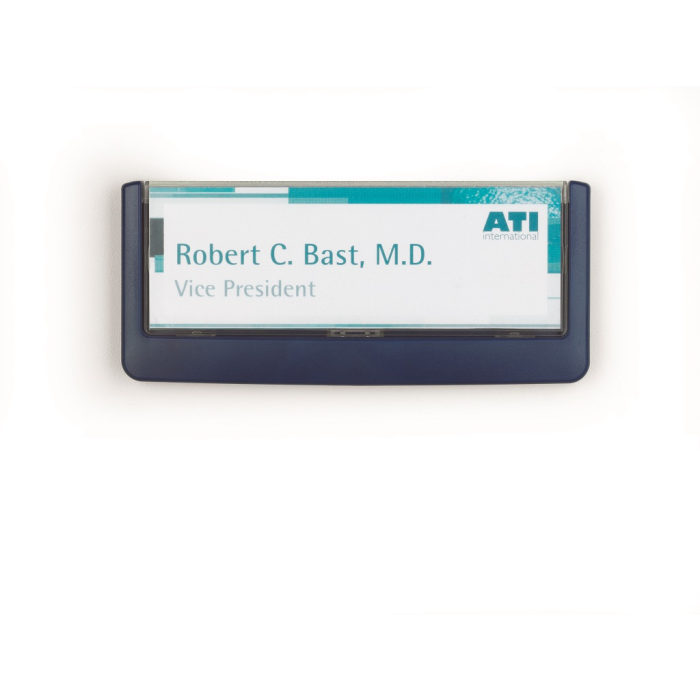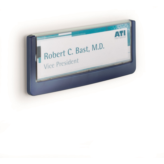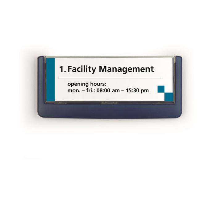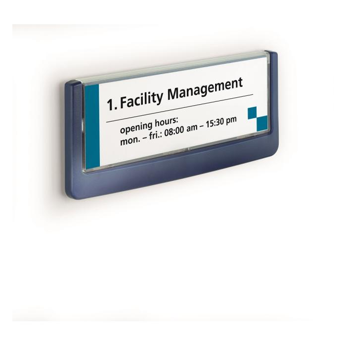 Moderná informačná tabuľka na dvere s lemom v atraktívnej modrej farbe. Predný panel sa otvára na jedno zatlačenie, a tým sa jednoducho sprístupnia vložené popisné papiere, ktoré sa môžu vymieňať podľa potrieb. Tabuľka je ideálna do kancelárií, úradov, škôl, univerzít a hotelov. Súčasťou balenia je montážna sada s názorným návodom. Namiesto pevného montovania môže byť tabuľka k povrchu aj prilepená.