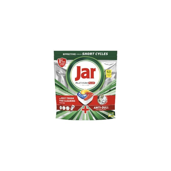 Kapsuly do umývačky riadu Jar Platinum Plus All in One zanechajú riad čistý ako nový, zabezpečia najlepšie čistenie odolného jedla od kolekcie značky Jar a dokonca pomáhajú odstrániť vyblednutie vytvorené v priebehu času a obnoviť pôvodný lesk vášho riadu. Jar Platinum Plus prináša vynikajúce výsledky čistenia a odstraňuje odolné škvrny od jedla dokonca aj pri testovaní v extrémnych podmienkach čistenia v krátkom cykle. Takže ak máte málo času, nič sa nedeje. Prepnite na krátky cyklus. Jar kombinuje tekutinu a prášok do jednej silnej kapsuly. Jej vysokorozpustné vrecko sa rýchlo rozpustí a je vysoko účinné v krátkych programoch, keďže čistí hneď od jeho začiatku. A tak ľahko sa používajú! Nemusíte ich odbaľovať, stačí vložiť do dávkovača na čistiaci prostriedok do umývačky riadu. Prepnite na krátky cyklus* a ušetrite čas, energiu a vodu v porovnaní s bežným, štandardným cyklom!