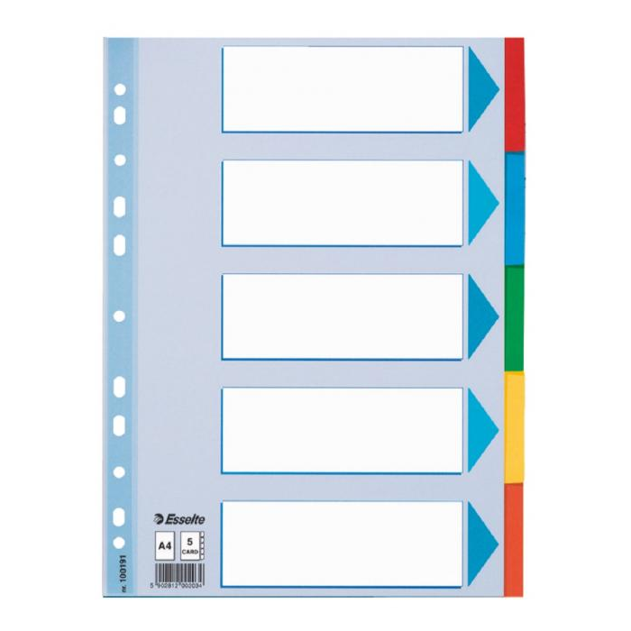 Celofarebný rozraďovač Esselte vyrobený z kartónu v rôznych farbách. Formát A4, eurodierovanie, popisovateľný titulný list na jasnú identifikáciu obsahu. Balenie jedna sada v polyesterovom sáčku. Väčšie balenie 20 sád. Formát: A4 Popis: s titulným listom