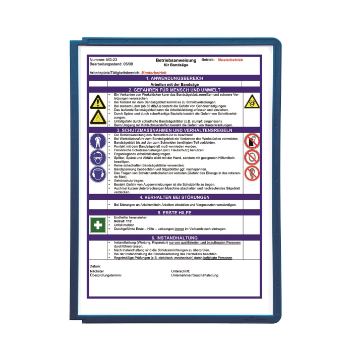 Displejový panel vyrobený z matného antireflexného polypropylénu pre systém Sherpa, kovové držiaky a rotačný stojan. Vložený materiál je kopírovateľný a skenovateľný. Pevný farebný rám s pozíciami pre indexy. Formát A4. Balenie 5 ks. Farba rámu: tmavomodrá Popis: pozície pre indexy