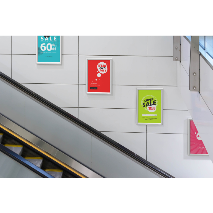 Robustný rám vo veľkosti A3 pre rýchle menenie dokumentov/motívu vďaka zaklapávaciemu systému. Odolný voči UV žiareniu vďaka nízkoreflexnej ochrannej fólii.